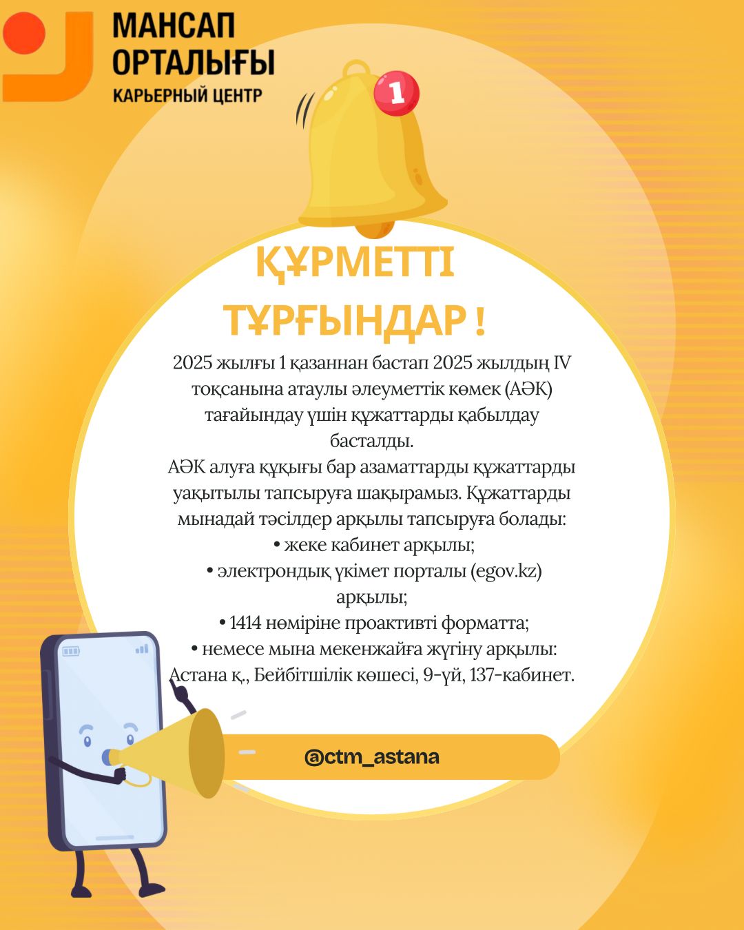2025 жылғы 1 қазаннан бастап 2025 жылдың IV тоқсанына атаулы әлеуметтік көмек (АӘК) тағайындау үшін құжаттарды қабылдау басталды.