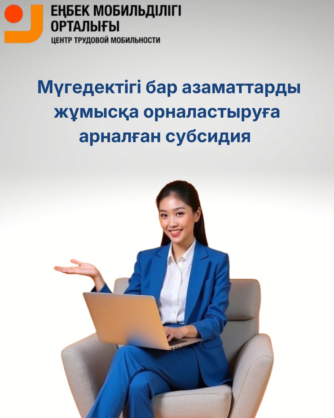 «Астана қаласы әкімдігінің Еңбек мобильділігі орталығы» КММ мүгедектігі бар азаматтарды жұмысқа орналастыру мақсатында арнайы жұмыс орнын жабдықтау үшін жұмыс берушілердің шығындарына субсидия бөлінетінін хабарлайды. Субсидия арнайы жұмыс орнына жабдықтарды сатып алуға, монтаждауға және орнатуға жұмсалған шығындарды өтеу үшін беріледі.