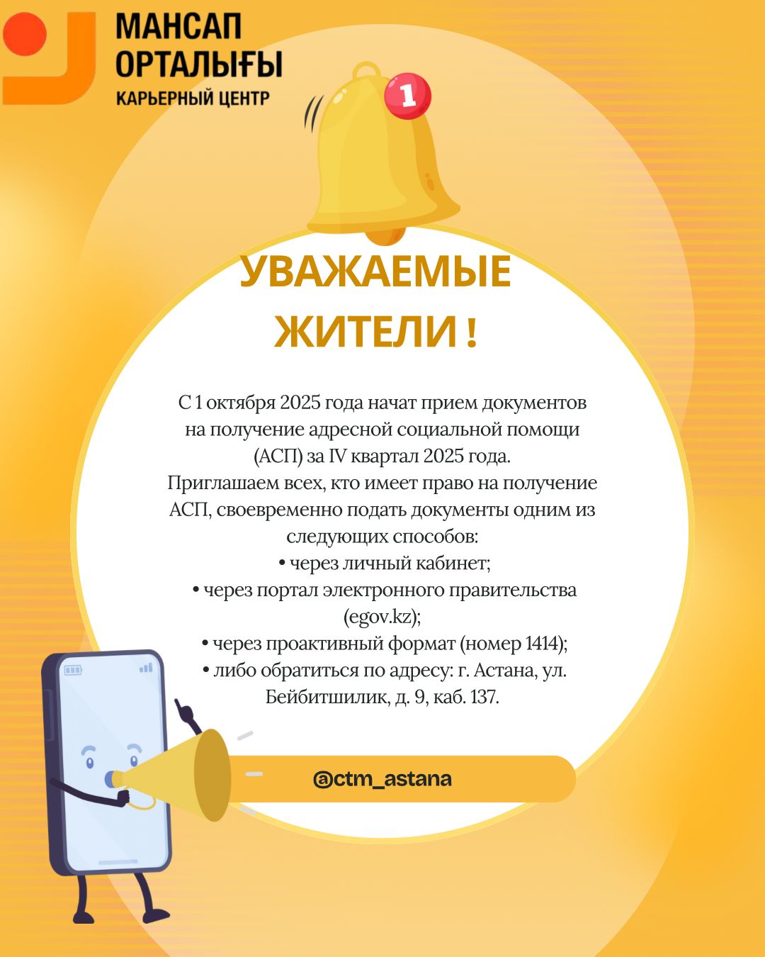 С 1 октября 2025 года начат прием документов на получение адресной социальной помощи (АСП) за IV квартал 2025 года.