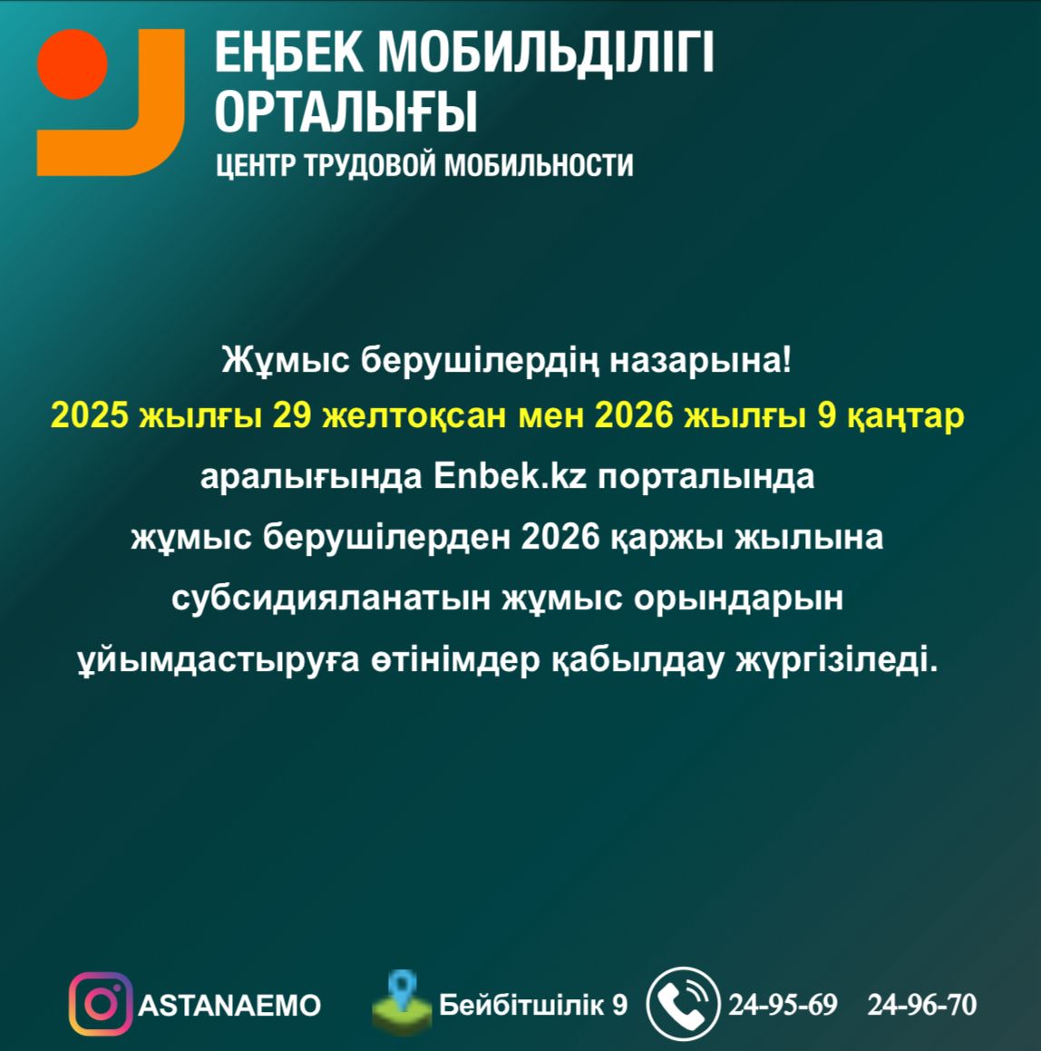 Жұмыс беруші онлайн-өтінімді Enbek.kz порталындағы жеке кабинеті арқылы бере алады. Мемлекет тарапынан субсидияланатын жұмыс орындарын ұйымдастыру және қаржыландыру мәселелері бойынша: